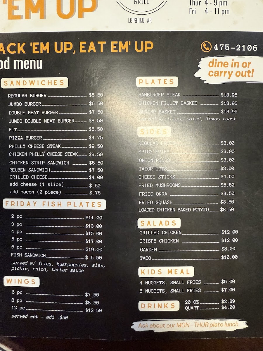 This menu is designed to serve a range of meal occasions, from snacks and appetizers to full meals, suitable for casual dining or quick orders during visits to the location. It includes both fried and grilled items, sandwiches, and salads, providing diverse options for different preferences and appetites.